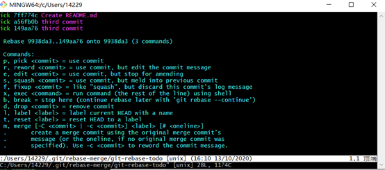 键入命令git rebase -i head^^^(^的个数代表前几条记录)