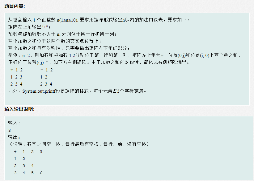 从键盘输入1个正整数n(1<=n<=10),要求用矩阵形式输出n以内的加法口诀表,要求如下: