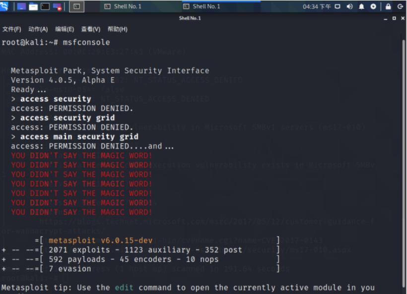 打开metasploit(msf很有意思的是,每次打开都会显示不同的画面。)
