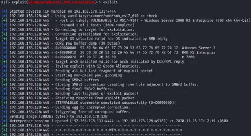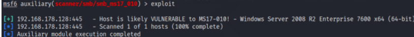 开始扫描漏洞,再次证实靶机存在MS17-010漏洞。