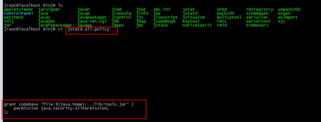 然后在jdk的安装目录bin下新建文件jstatd.all.policy,并在该文件中输入如下内容,保存退出(按ESC键,输入:wq),