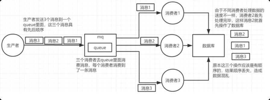 ①一个queue,有多个consumer去消费,这样就会造成顺序的错误,consumer从MQ里面读取数据是有序的,但是每个consumer的执行时间是不固定的,无法保证先读到消息的consumer一定先完成操作,这样就会出现消息并没有按照顺序执行,造成数据顺序错误。