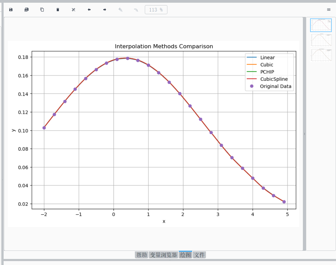 y_interps = {name: func(x_interp) for name, func in interp_functions.items()}