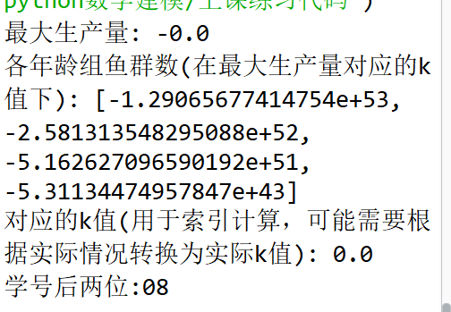 print('各年龄组鱼群数(在最大生产量对应的k值下):', X[ind])