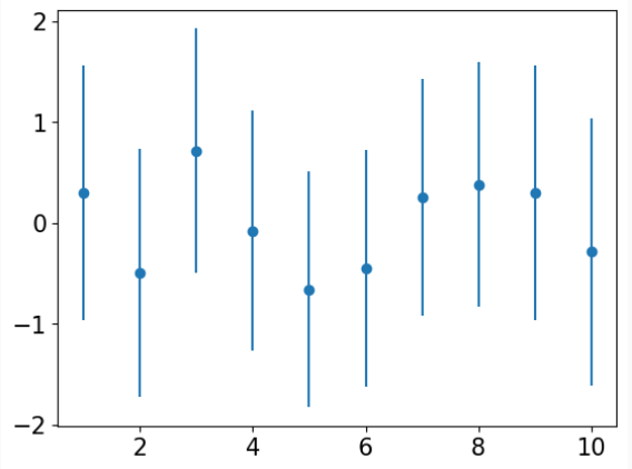 plt.errorbar(num, model.resid, error_bars, fmt='o')