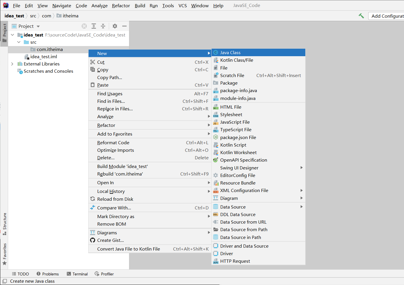 IDEA中新建一个类,然后在选中包点右键,选New,选Java Class