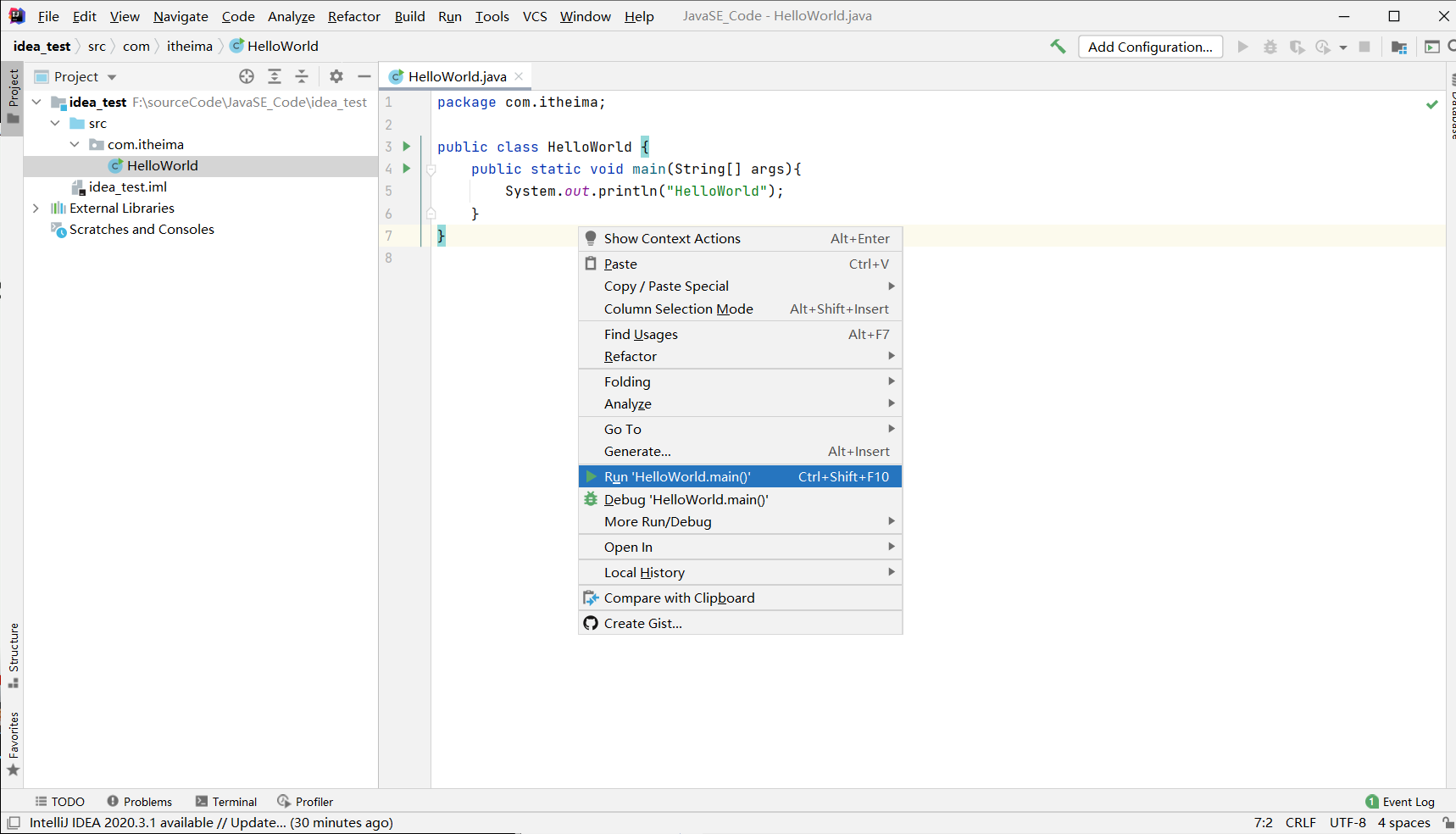 IDEA中执行程序,最后我们在当前代码区域中右键,选Run来执行这个代码