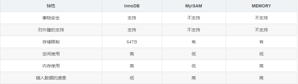 其区别提现在事物安全、存储限制、空间使用、插入数据的速度和对外键的支持上,具体如下: