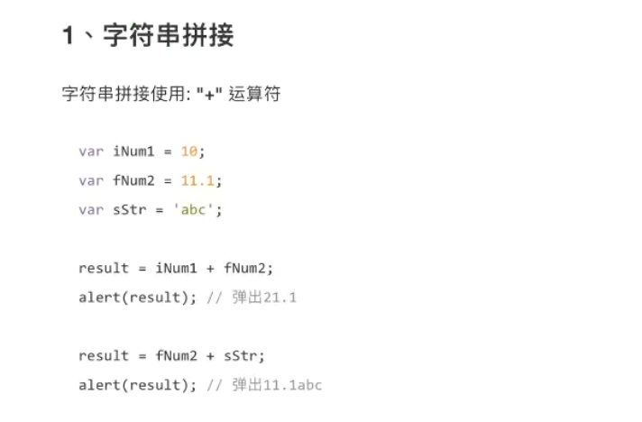 <!DOCTYPE html> <html lang="en"> <head> <meta charset="UTF-8"> <meta name="viewport" content="width=device-width, initial-scale=1.0"> <title>Document</title> <script> var sName = '李四'; var iAge = '20'; var sSex = '男'; var sResult = sName + sSex; alert(sResult) // 字符串和数字进行拼接,底层自动把数字类型转换成字符串,这种操作叫隐式类型转换 sResult = sName + iAge; alert(sResult); // += iAge += sSex alert(iAge) </script> </head> <body> </body> </html>