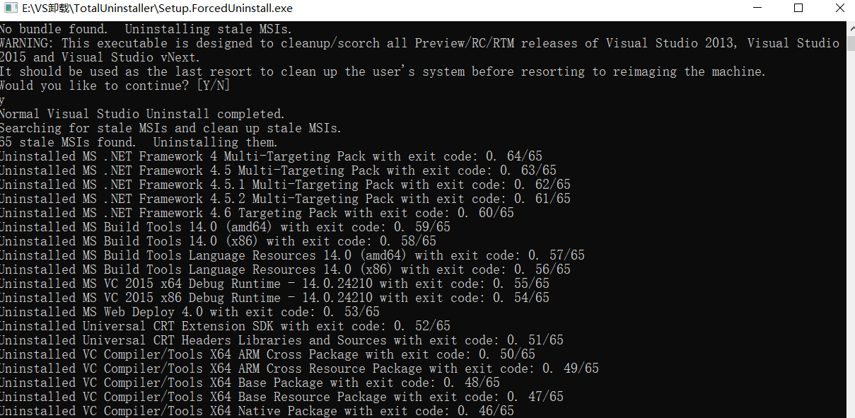TotalUninstaller.zip,找到Setup.ForcedUninstall.exe,右键以管理员身份运行。输入y,确认卸载。 - 卸载过程如图