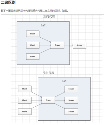 实际上,Proxy在两种代理中做的事情都是替服务器代为收发请求和响应,不过从结构上看正好左右互换了一下,所以把后出现的那种代理方式称为反向代理了。
