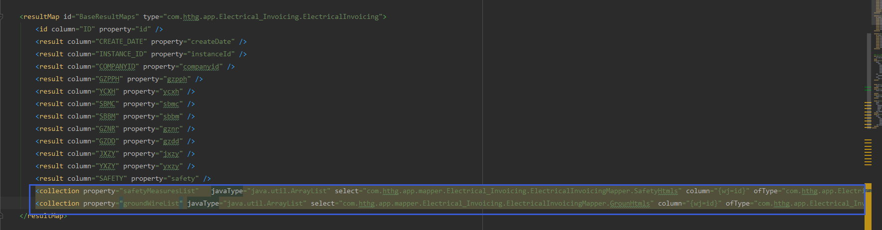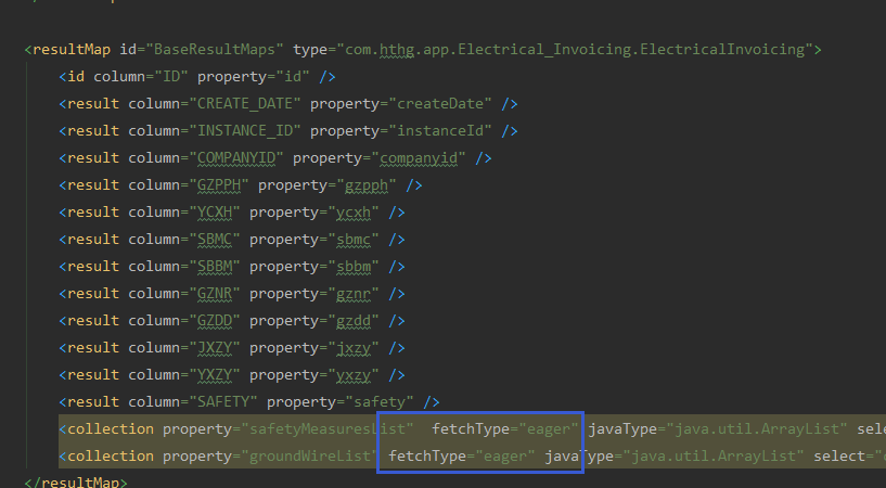 在使用mybatis进行一对多查询,出现以上错误时。在以下图2()中蓝色框的位置中加入 fetchType="eager" (图(1)、图(2)对比以下就可以了)