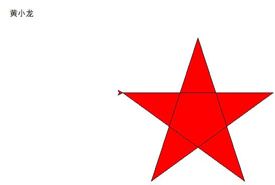 import turtle # 设置画布大小 # turtle.screensize(canvwidth=None, canvheight=None, bg=None) turtle.setup(500,500,200,200) # 设置初始位置 turtle.penup() turtle.left(90) turtle.fd(-150) turtle.pendown() turtle.right(90) # 输出文字 printer = turtle.Turtle() printer.hideturtle() printer.penup() printer.back(200) printer.write("黄小龙", align="center", font=("黑体", 12, "normal")) import turtle as t t.fillcolor("red") t.begin_fill() for i in range(5): t.fd(300) t.right(144) t.end_fill() t.done()