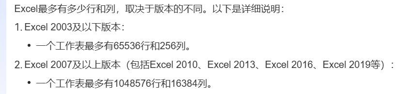 不同版本的excel,一个工作表都有最大行数限制,最大行数限制如下,而导出失败的表超过了excel最大行数限制