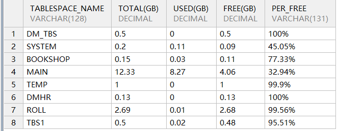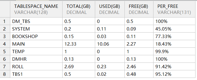 结果如下:系统表空间main总大小12G,使用10G,空闲2G
