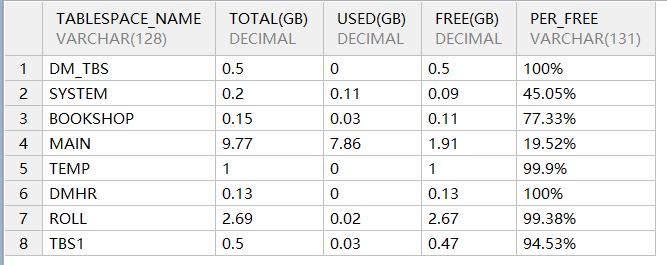 数据库重启之后,表空间使用率如下,MAIN表空间总大小没变,空闲空间有4G