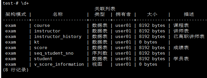 \d 列出表,视图,序列,系统对象 后面加+可以看到更多详细信息