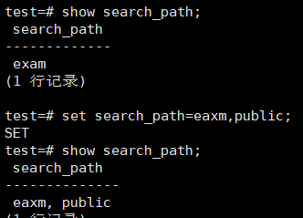 调整search_path搜索路径,如下所示,优先从exam模式查找对象,匹配上就停止搜索,匹配不上就一个模式搜索