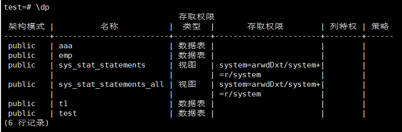 \dp 列出表,视图等相关权限