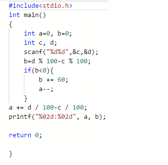 输入在一行中给出2个4位正整数,其间以空格分隔,分别表示火车的出发时间和到达时间。每个时间的格式为2位小时数(00-23)和2位分钟数(00-59),假设出发和到达在同一天内。