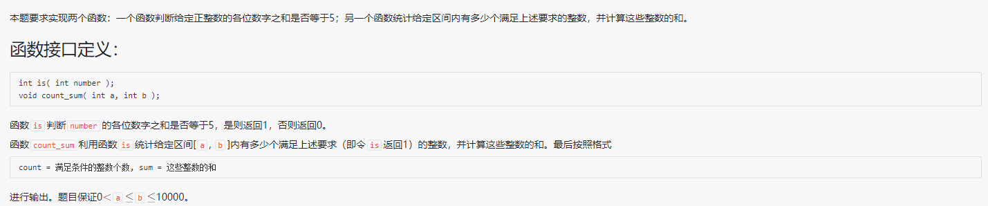本题要求实现两个函数:一个函数判断给定正整数的各位数字之和是否等于5;另一个函数统计给定区间内有多少个满足上述要求的整数,并计算这些整数的和。