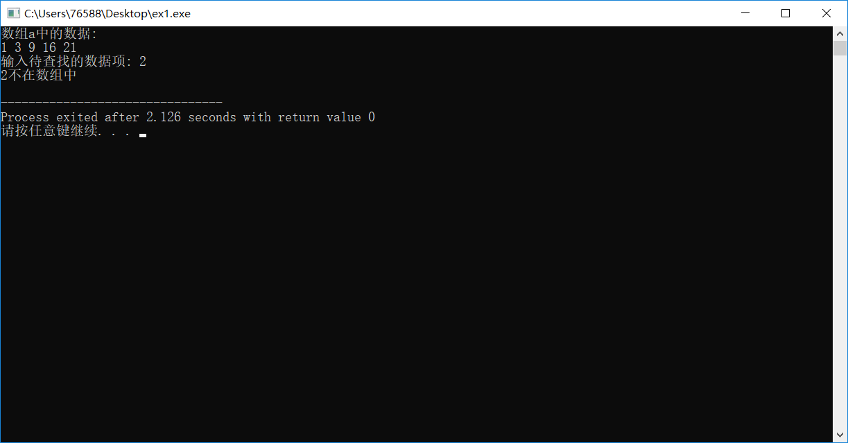 1 #include <stdio.h> 2 const int N=5; 3 int binarySearch(int *x, int n, int item); 4 int main() { 5 int a[N]={1,3,9,16,21}; 6 int i,index, key; 7 printf("数组a中的数据:\n"); 8 for(i=0;i<N;i++) 9 printf("%d ",a[i]); 10 printf("\n"); 11 printf("输入待查找的数据项: "); 12 scanf("%d", &key); 13 index=binarySearch(a,N,key); 14 if(index>=0) 15 printf("%d在数组中,下标为%d\n", key, index); 16 else 17 printf("%d不在数组中\n", key); 18 return 0; 19 } 20 int binarySearch(int *x, int n, int item) { 21 int low, high, mid; 22 low = 0; 23 high = n-1; 24 while(low <= high) { 25 mid = (low+high)/2; 26 if (item == *(x+mid)) 27 return mid; 28 else if(item<*(x+mid)) 29 high = mid - 1; 30 else 31 low = mid + 1; 32 } 33 return -1; 34 }