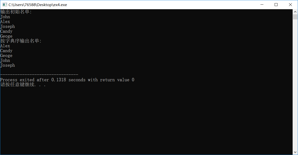 1 #include <stdio.h> 2 #include <string.h> 3 #define M 20 4 void selectSort(char str[][20], int n ); // 函数声明,形参str是二维数组名 5 int main() { 6 char name[][20] = {"John", "Alex", "Joseph", "Candy", "Geoge"}; 7 int i; 8 printf("输出初始名单:\n"); 9 for(i=0; i<5; i++) 10 printf("%s\n", name[i]); 11 selectSort(name, 5); // 调用选择法对name数组中的字符串排序 12 printf("按字典序输出名单:\n"); 13 for(i=0; i<5; i++) 14 printf("%s\n", name[i]); 15 return 0; 16 } 17 // 函数定义 18 // 函数功能描述:使用选择法对二维数组str中的n个字符串按字典序排序 19 void selectSort(char str[][20], int n) { 20 int i,j; 21 char t[M]; 22 for(i=0;i<n-1;i++) 23 for(j=0;j<n-1-i;j++) 24 if(strcmp(str[j],str[j+1])>0) 25 { 26 strcpy(t,str[j]); 27 strcpy(str[j],str[j+1]); 28 strcpy(str[j+1],t); 29 } 30 }