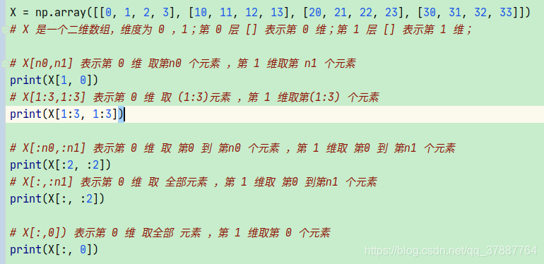 这是最通用的切片操作,表示取 第0维 的第 s0 到 e0 个元素,继续取 第1维 的第 s1 到 e1 个元素(左闭右开)。如 X[1:3,1:3] 表示第0维第(1:3)个元素[[10,11,12,13],[20,21,22,23]],然后取其第1维的第(1:3)个元素即 [[11,12],[21,22]];