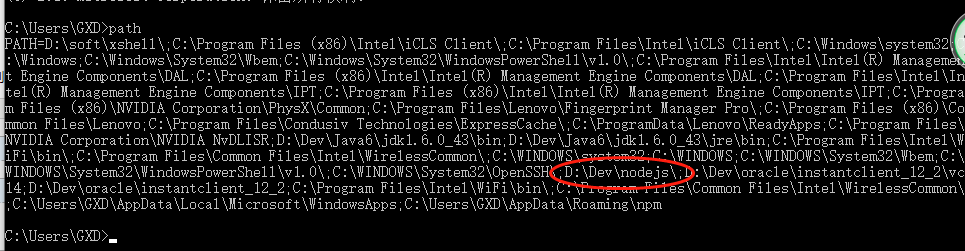 1)检测PATH环境变量是否配置了Node.js,在命令提示符控制台输入命令"path",输出如下结果:(我安装在了D:\Dev目录下)