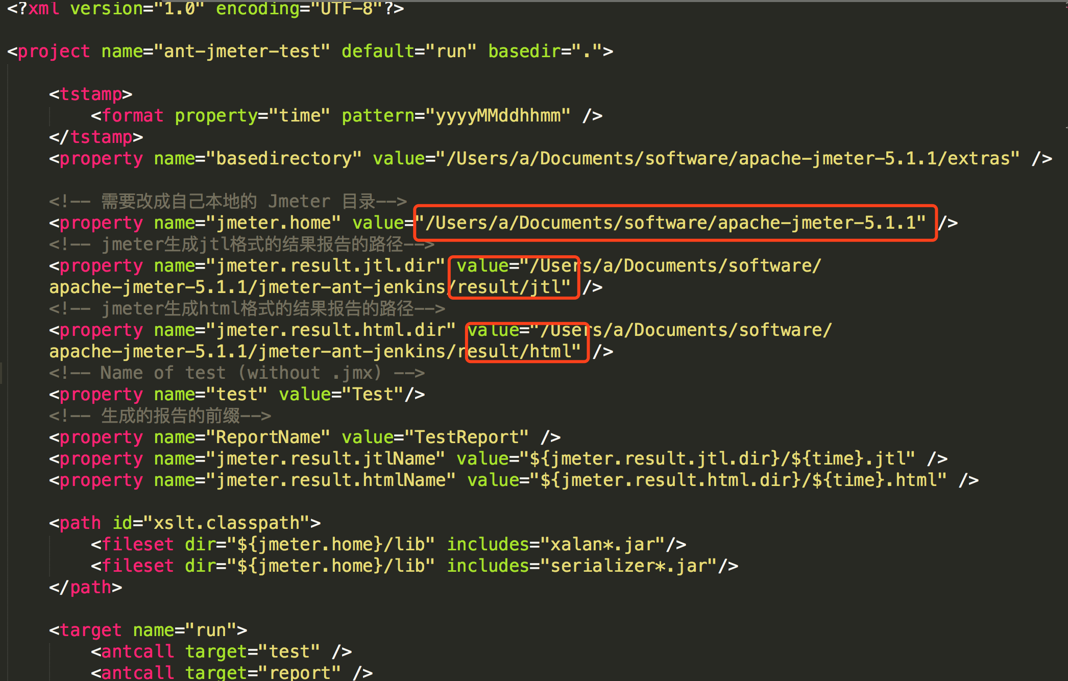 3、在/Users/a/Documents/software/apache-jmeter-5.1.1/jmeter-ant-jenkins文件中建立一个build.xml文件,build.xml内容如下: