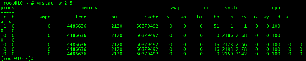 3:不加任何参数,vmstat命令只输出一条记录,这个数据是自系统上次重启之后到现在的平均数值。