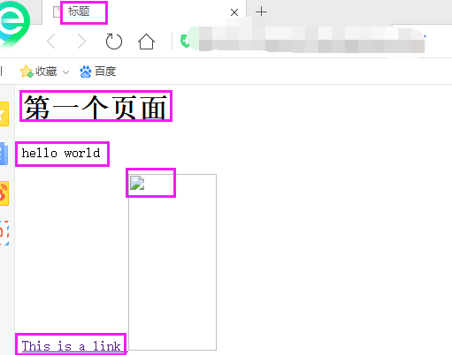 <html> <head> <title>标题</title> </head> <body style='background-color:#E0FFFF'> <h1>第一个页面</h1> <p style = 'font-family:楷书;color:purple;font-size:20px;text-align:center'>hello world</p> <p style = 'font-family:楷书;color:#00FFFF;text-align:center'>这是我的第二段文字哈</p> <a href = "https://www.baidu.com/"> This is a link </a> <img src = "1.jpg" width="100" height = "200" /> </img> </body> </html>