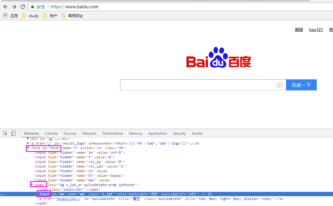 #/usr/bin python #-*- coding:UTF-8 -*- from selenium import webdriver from time import sleep driver = webdriver.Chrome() driver.get("https://www.baidu.com/") # #根据id 来定位 # driver.find_element_by_css_selector('#kw').send_keys('selenium 官网') #通过属性来定位 driver.find_element_by_css_selector('[autocomplete = "off"]').send_keys('selenium 官网') #根据class 来定位 # driver.find_element_by_css_selector('.s_btn').click() #通过元素层级来定位 form#form(#后面对应的是 标签的id值) driver.find_element_by_css_selector('form#form>span>input').click() sleep(3) driver.quit()