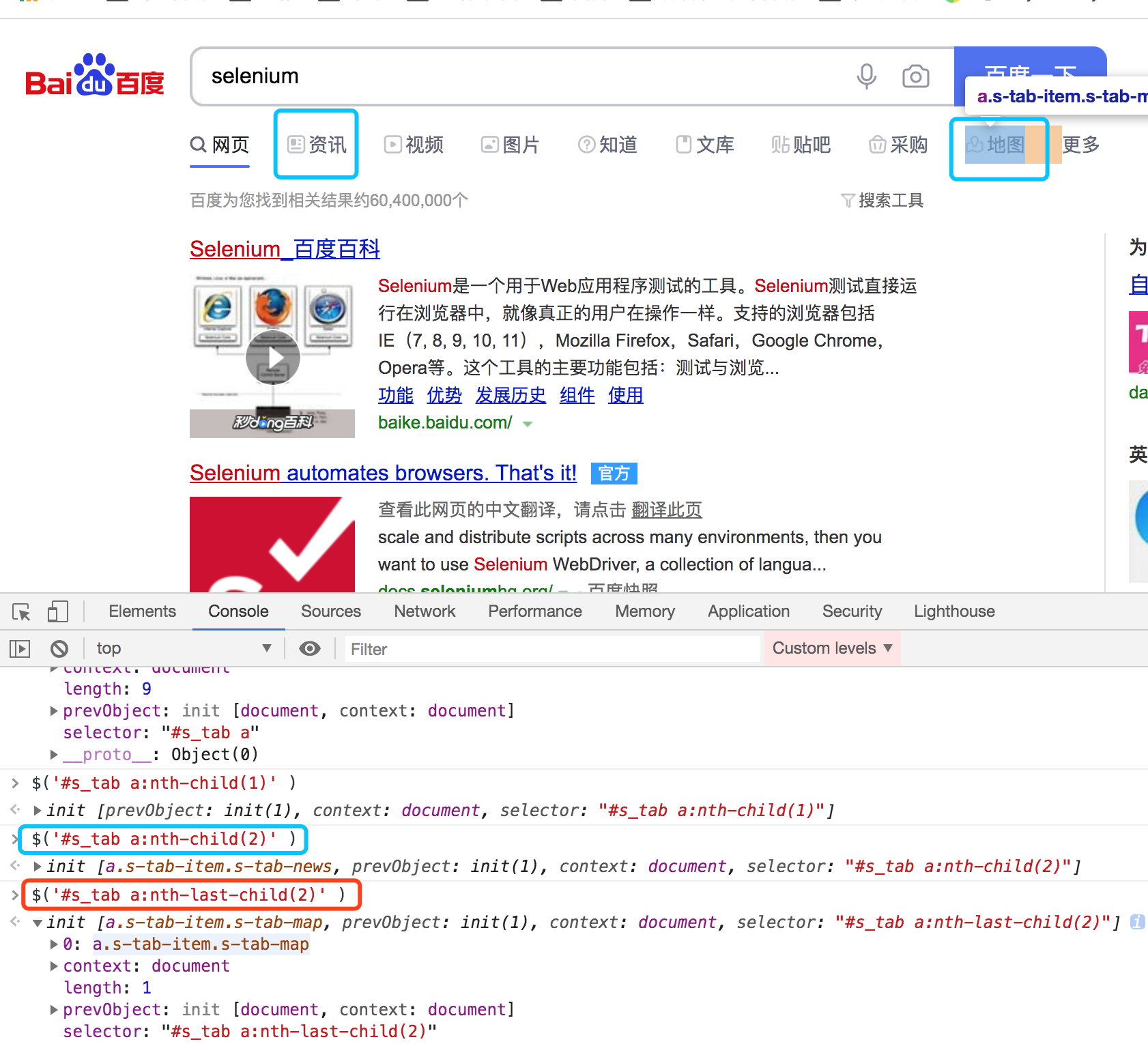 - $x('//*[@id="s_tab"]//a[last()-1]') 说明:在浏览器开发者模式下 $x() 代表xpath语言,//* 选取所有元素,[@id="s_tab"] 是一个条件,属性是什么,// 从父元素中找子孙元素,a[last()-1] a标签中倒数第二个