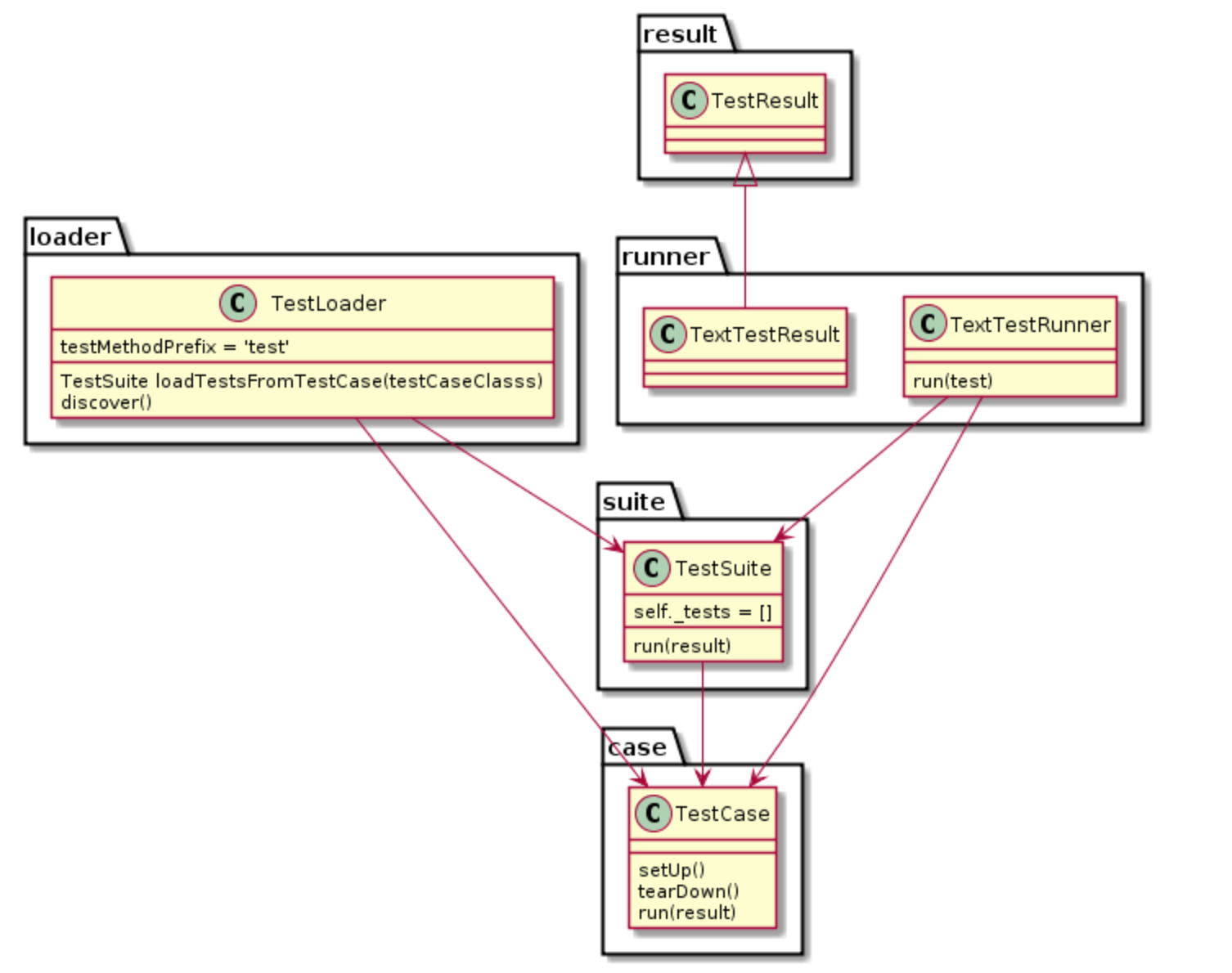 - unittest的流程:写好TestCase,然后由TestLoader加载TestCase到TestSuite,然后由TextTestRunner来运行TestSuite,运行的结果保存在TextTestResult中,我们通过命令行或者unittest.main()执行时,main会调用TextTestRunner中的run来执行,或者我们可以直接通过TextTestRunner来执行用例。