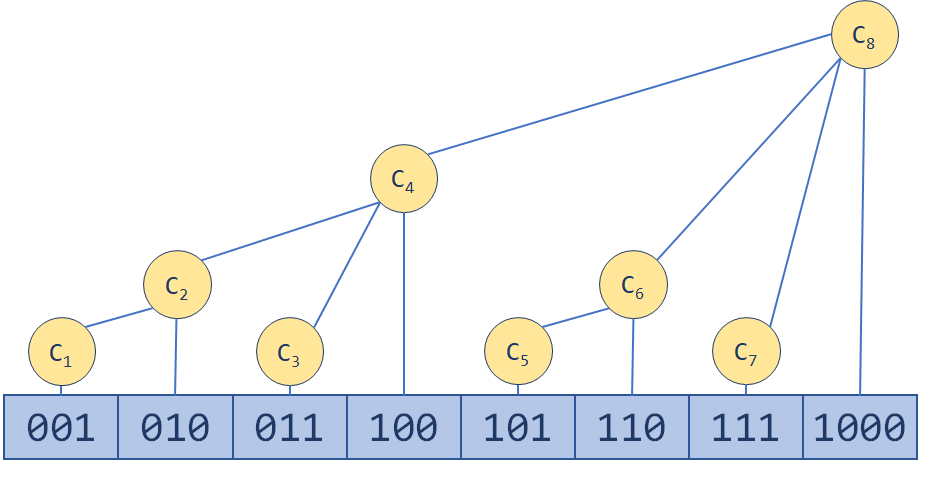 可以看到树状数组和原来的数组的节点个数是一一对应的。