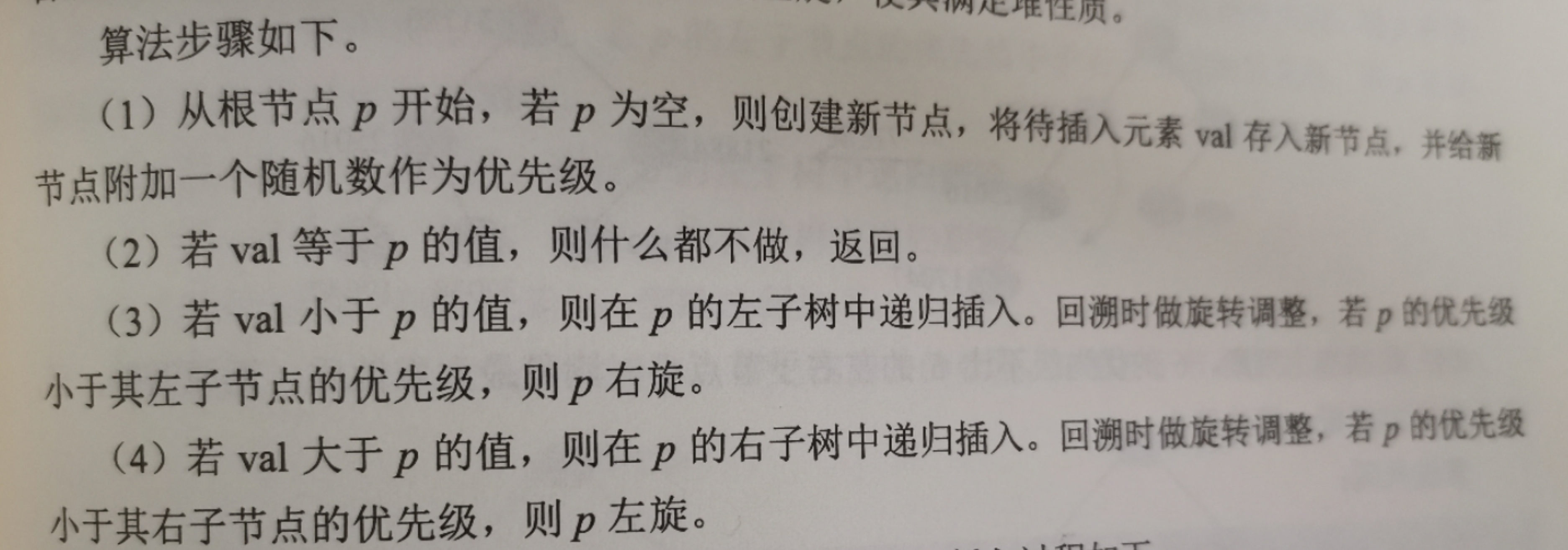 插入之后,沿着插入的路径回去看优先级大小,如果不满足堆,注意因为是沿着路径往回找,而此时矛盾的点就仅在于上面的p和q的优先级,也就是说q相当于新插入的点,递归回来到了这个位置,p是原来的点。而p的优先级显然大于除了q之外所有的点的优先级,因为只有q是新插入的点。然后我们发现旋转之后,新子树优先级满足大根堆的性质,也满足查找树的性质。