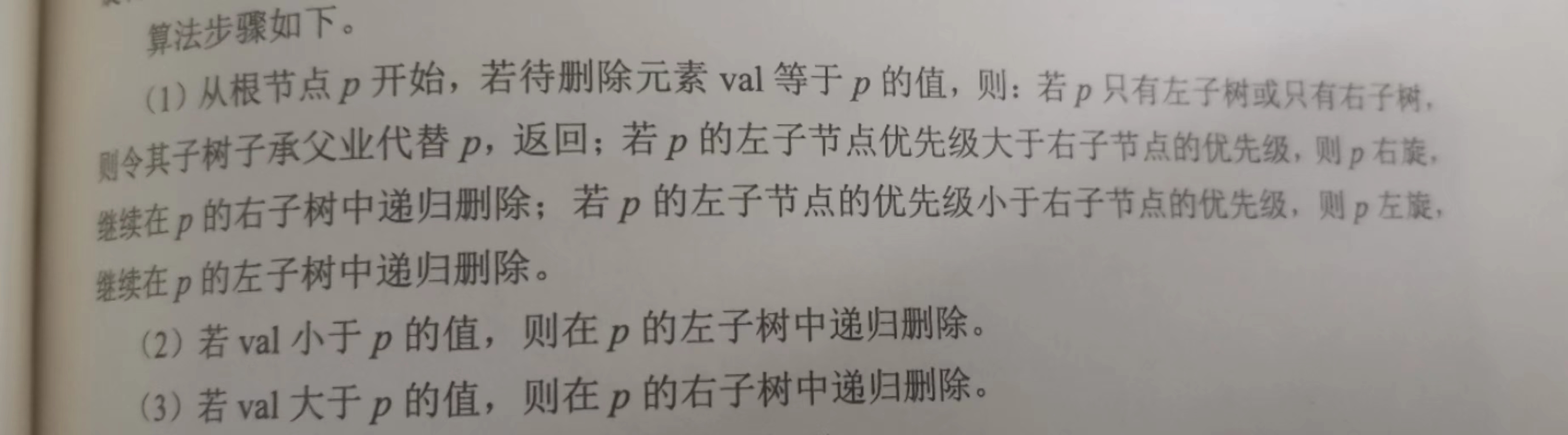 删除:找到被删除的节点,将该节点向优先级较大的子节点旋转,递归到旋转到的位置执行删除,一直旋转到叶子,然后删除叶子的位置就行了。