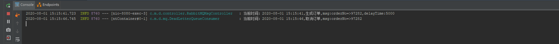 @Slf4j @Component public class DeadLetterQueueConsumer { @RabbitListener(queues = DELAYED_QUEUE_NAME) public void receiveD(Message message, Channel channel) throws IOException { String msg = new String(message.getBody()); log.info("当前时间:{},取消订单,msg:{}",new SimpleDateFormat("yyyy-MM-dd HH:mm:ss").format(new Date()), msg); channel.basicAck(message.getMessageProperties().getDeliveryTag(), false);