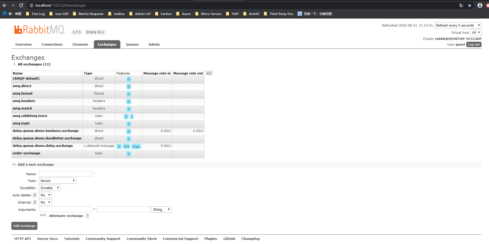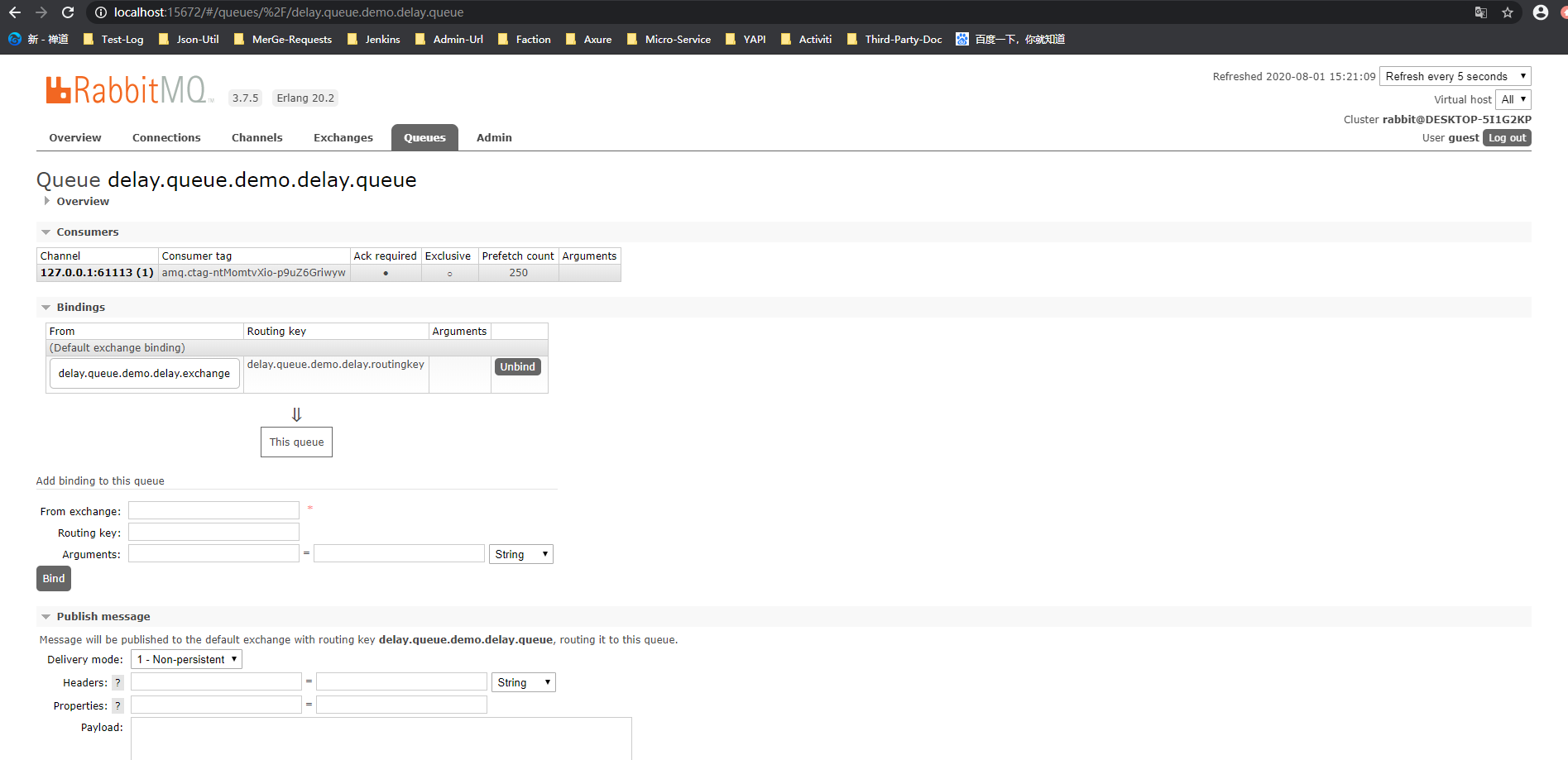 @Configuration public class DelayedRabbitMQConfig { public static final String DELAYED_QUEUE_NAME = "delay.queue.demo.delay.queue"; public static final String DELAYED_EXCHANGE_NAME = "delay.queue.demo.delay.exchange"; public static final String DELAYED_ROUTING_KEY = "delay.queue.demo.delay.routingkey"; @Bean public Queue immediateQueue() { return new Queue(DELAYED_QUEUE_NAME); } @Bean public CustomExchange customExchange() { Map<String, Object> args = new HashMap<>(); args.put("x-delayed-type", "direct"); return new CustomExchange(DELAYED_EXCHANGE_NAME, "x-delayed-message", true, false, args); } @Bean public Binding bindingNotify(@Qualifier("immediateQueue") Queue queue, @Qualifier("customExchange") CustomExchange customExchange) { return BindingBuilder.bind(queue).to(customExchange).with(DELAYED_ROUTING_KEY).noargs(); } }