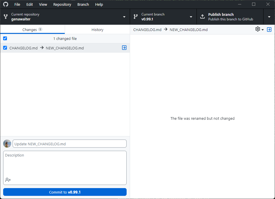 git add *以便 git 将其注册为重命名的文件而不是删除的文件和添加的文件。 - 在 GitHub Desktop 中,查看文件差异并注意未显示修改。相反,它仅显示“文件已重命名但未更改”