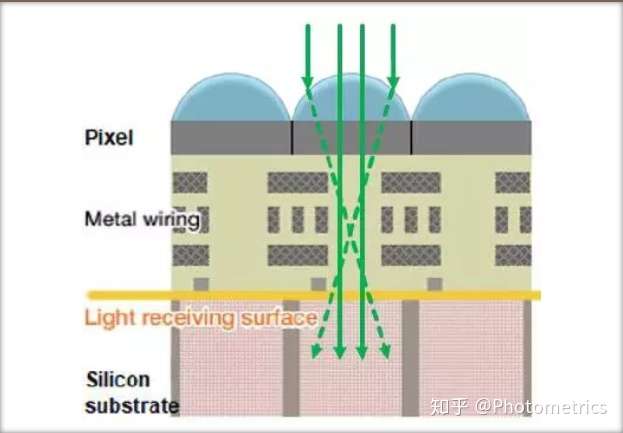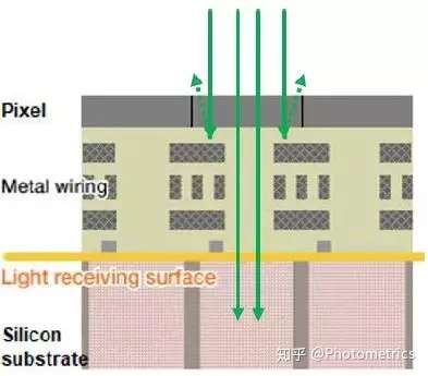 普通CCD/CMOS芯片,像素表面都有部分被不透光的金属结构覆盖,光子无法透过并到达检测区,导致QE损失。(图3)
