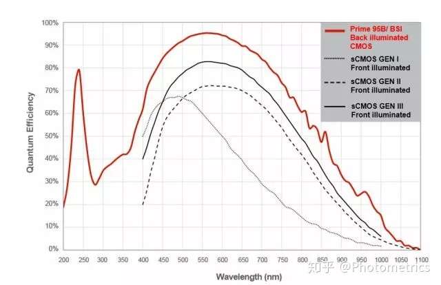 图1. 一些典型CMOS相机的QE曲线图 (采自Princeton Instruments, Kuro sCMOS)