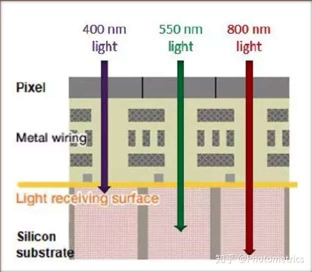 光在半导体材料中的穿透性和波长相关。500~600nm的黄绿色光,正好能穿透到检测材料的中间,所以检测效率最高。波长变短时,越多光子在到达检测区前就被吸收;波长变长时,越多光子会穿过检测区,或因为能量不足,无法生成光电子。所以我们看到的QE曲线是中间高,两侧降低的。