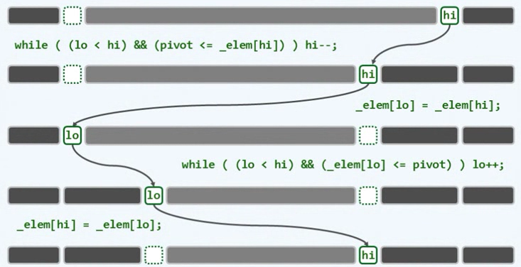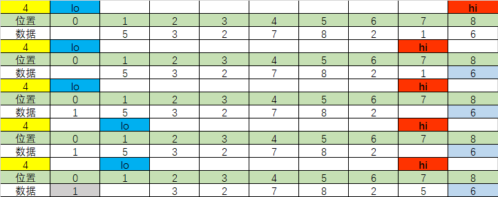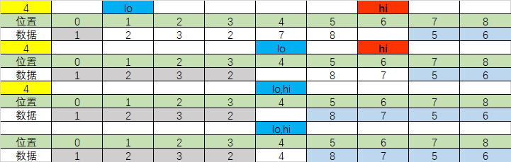 黄色位置代表当前轴点,黑色位置代表左侧小于轴点区域,蓝色位置代表右侧大于轴点位置,lo代表的是左侧哨兵的当前位置,hi代表的是右侧哨兵的当前位置