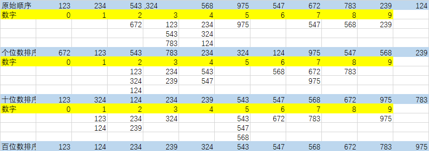 我们依次检索个位,统计每一个数据的个位数,依次放置在 0-9 九个格子里,代表其个位数据。