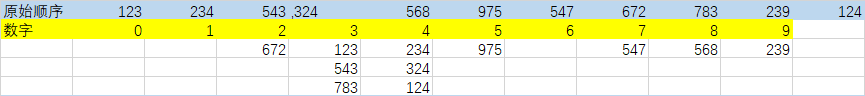 这个时候我们记录每一个 个位数数据在重新排列之后的初始位置。