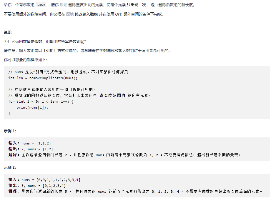 1 class Solution { 2 public: 3 int removeDuplicates(vector<int>& nums) { 4 int present_data=0; 5 int after_data=0; 6 int length = nums.size(); 7 int result_number = 0; 8 for(int i=0; i<length-1; i++) 9 { 10 present_data = nums[i]; 11 result_number = i; 12 //检验present_data后面的数据,是否与其相等 13 for(int j=i+1; j<length; j++) 14 { 15 after_data = nums[j]; 16 if(after_data==present_data) 17 { 18 //如果相等则记录位置 19 result_number = j; 20 } 21 //不相等则跳出 22 else 23 break; 24 } 25 result_number +=1; 26 //如果存在重复值,删除掉区间[i+1, result_number) 27 if(result_number-i>1) 28 { 29 nums.erase(nums.begin()+i+1,nums.begin()+result_number); 30 length = nums.size(); 31 } 32 } 33 return nums.size(); 34 } 35 };