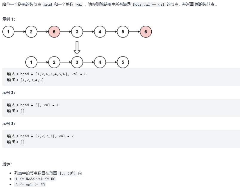 /** * Definition for singly-linked list. * struct ListNode { * int val; * ListNode *next; * ListNode() : val(0), next(nullptr) {} * ListNode(int x) : val(x), next(nullptr) {} * ListNode(int x, ListNode *next) : val(x), next(next) {} * }; */ class Solution { public: ListNode* removeElements(ListNode* head, int val) { if(head == NULL )//如果链表为空,则返回 return head; struct ListNode* pre_node = head; //初始头结点不能为val while(head!=NULL && head->val==val){ head = head->next; } while(pre_node->next !=NULL){ if(pre_node->next->val != val) { pre_node = pre_node->next; continue; } else{//如果等于val pre_node->next = pre_node->next->next; } } return head; } };