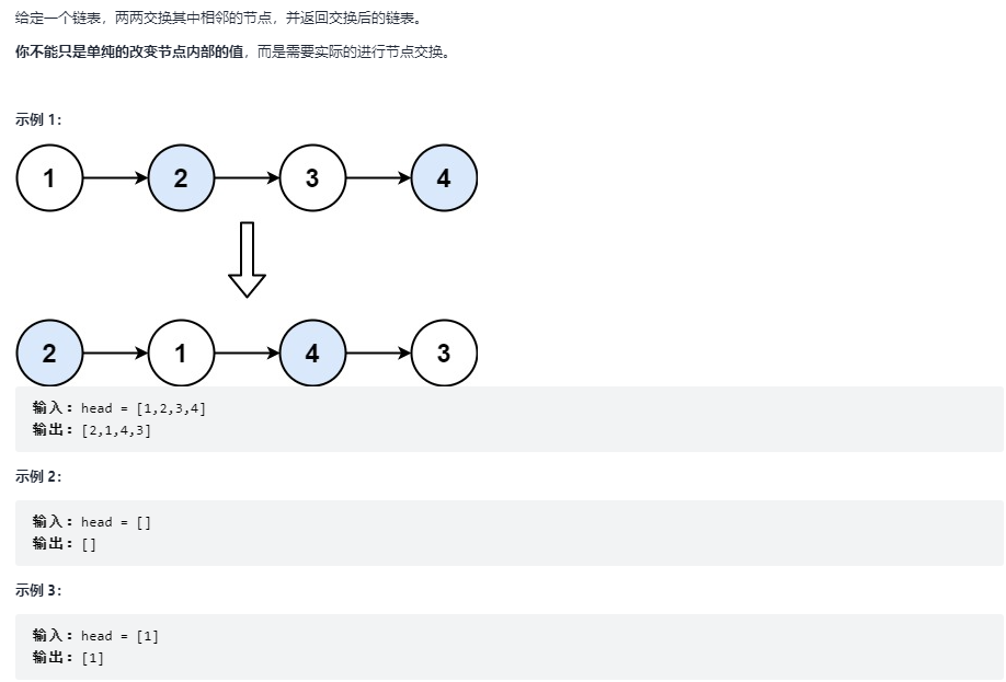 public ListNode swapPairs(ListNode head) { if(head == null || head.next == null){ return head; } ListNode next = head.next; head.next = swapPairs(next.next); next.next = head; return next; }